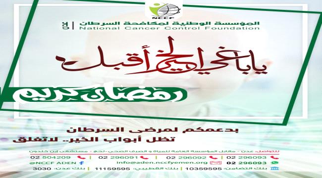 تستعد المؤسسة الوطنية لمكافحة السرطان - عدن لتدشين حملتها السنوية "الحملة الوطنية لدعم مرضى السرطان 2023م / رمضان 1444هـ"، وذلك في إطار الخدمات المختلفة التي تقدمها للتخفيف من معاناة مرضى السرطان.